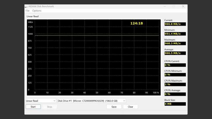 在 AIDA64 Disk Benchmark 中的 Linear Read,Block Size 設為 4MB。速度表現非常穩定,都在 960MB/s,不僅速度快,更是平的像一條線。全碟讀取平均值為 966.5MB/s,容量為 1863.0GB。