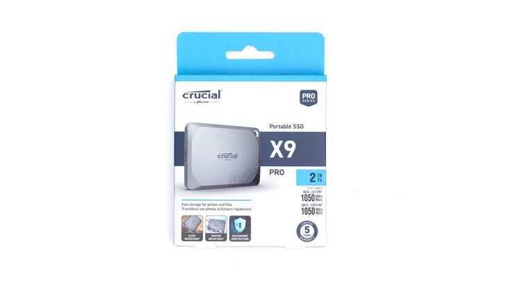 似乎是從 T700 PCIe Gen5 SSD 開始,Crucial 的包裝 CI 有了新的樣貌。相較過去從底部打拆盒裝,現在新的系列都改完從側邊打開。包裝左上角是 Crucial Logo,中間是銀色的 X9 Pro SSD 圖樣。以貼紙標示容量 2TB,讀取 1,050MB/s,寫入 1,050MB/s,保固五年。左下角也提到有加密功能和防塵防水,根據官方資料,具有 IP55 的防塵防水能力。