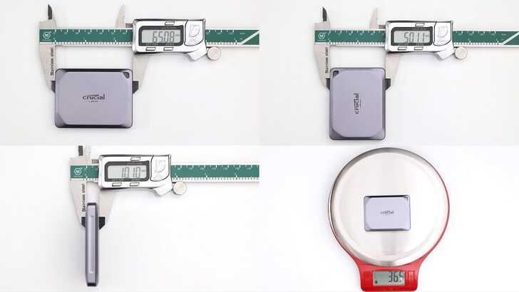官方沒有標示體積和重量。實測長度約 65mm,寬度約 50mm,厚度約 10mm,重量約 36.5g。隨附的 USB 線重量為 13.6g。重量比同容量的 X10 Pro 2TB 40.9g 還輕了一點。