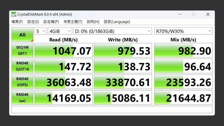 在 CrystalDiskMark 中,設定測試為五次 4GiB。最佳效能的設定下,循序讀取速度超過 1,000MB/s,來到 1,047MB/s,循序寫入速度也有 979MB/s,混合讀寫速度也有 982MB/s 的成績。