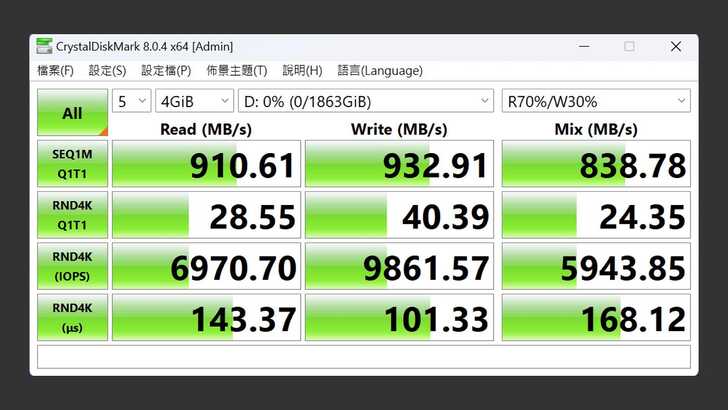 接著在 CrystalDiskMark 中,同樣設定測試為五次 4GiB,改為在真實世界的設定。循序讀取速度略為下降到 910MB/s,循序寫入速度則是 930MB/s,混合讀寫速度為 838MB/s。讀取和寫入的成績相較最佳效能下都些微有下降,但仍有 80~90% 的不錯表現。
