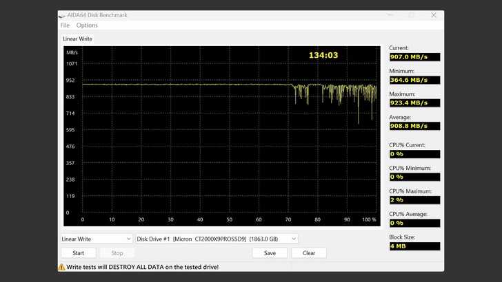 在 AIDA64 Disk Benchmark 中的 Linear Write,Block Size 設為 4MB。寫入速度曝片在 900MB/s 以上。到 72% 左右開始出現波動,平均值為 908MB/s。