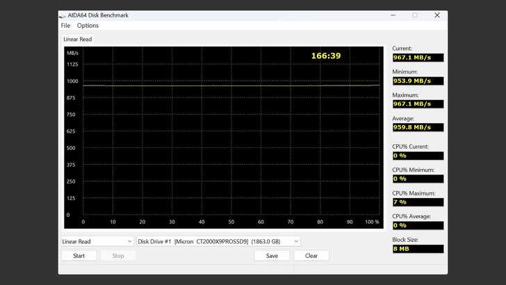 在 AIDA64 Disk Benchmark 中的 Linear Read,將 Block Size 改為 8MB。讀取速度依舊是穩穩地在 960MB/s,不過不知為何,測試時間倒是拉長了 40 分鐘。