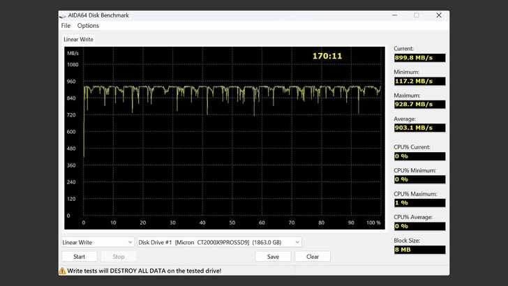在 AIDA64 Disk Benchmark 中的 Linear Write,將 Block Size 改為 8MB。速度表現呈現有規律的起伏,最終平均為 903MB/s。