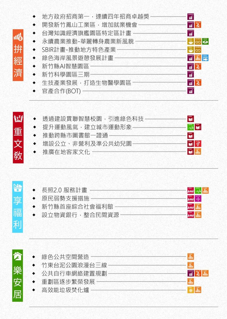 聯合國於2015年通過2030永續發展議程,所提出之17項永續發展核心目標(Sustainable Development Goals,SDGs)以及169項細項目標(Targets)。自2021年完成第一版VLR後,新竹縣亦於今年度8月完成了2023年中英文版VLR(電子檔案下載連結如下:( https://www.hcepbcc.com/modules/news/index.php?storytopic=11 )。內容除檢視新竹縣永續發展歷程以及轄內的自然、人口、產業等條件,同時亦揭露楊文科縣長之「拚經濟」、「重文教」、「享福利」及「樂安居」四大施政成果並契合17項聯合國永續發展目標。