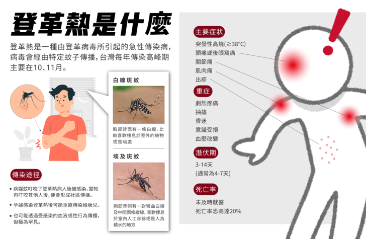 登革熱傳染途徑及主要症狀。(元樟生技提供)