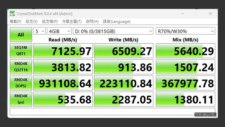 首先測試 CrystalDiskMark,以最佳效能設定檔做測試,得到了讀取 7,125MB/s,寫入 6,509MB/s 的可怕成績。這邊要注意的是由於這次使用 Intel 平台,其 PCI-E 最大的 Payload Size 僅有 256B,所以無法在 Intel 平台上達標 NM790 的最高速 7,400MB/s。至於 AMD 平台部分,多數 CPU 與 PCH 都有支援到 512B,有機會跑到官方宣稱的 7,400MB/s。不過如果是在 PCH 底下,還要確保 PCH 底下的 PCI-E 裝置都有支援到 MPS 512B。