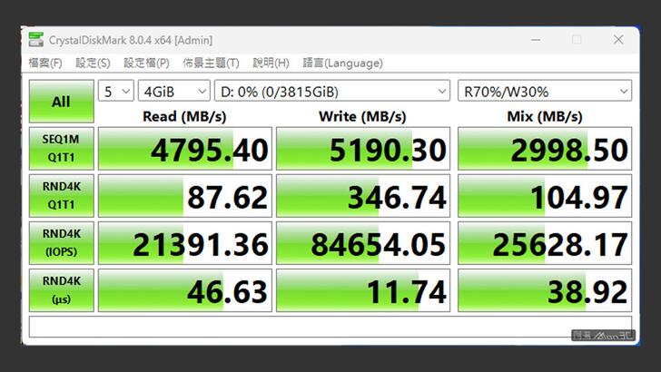 在現實世界設定檔中,也可以達到 4,795MB/s,寫入 5,190MB/s 的成績。另外跑分時,溫度大約可達 60~70 度左右,待機溫度大概 48 度。