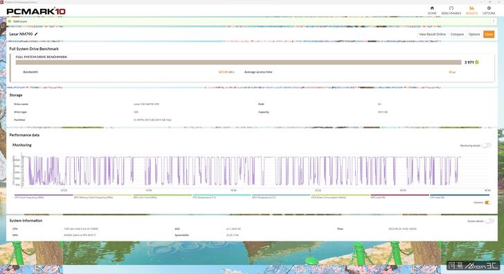 PCMark Full System Drive Benchmark,得分 3,971,頻寬測得 631.85MB/s。