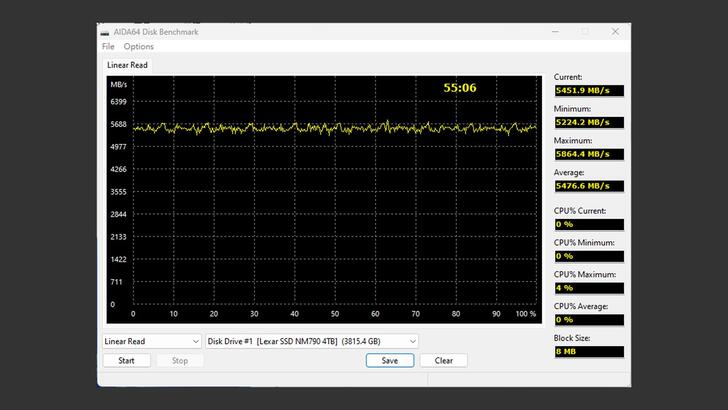 AIDA64,測試全硬碟的循序讀寫,首先是讀取部分,平均讀取速度可達穩定的 5,476MB/s。