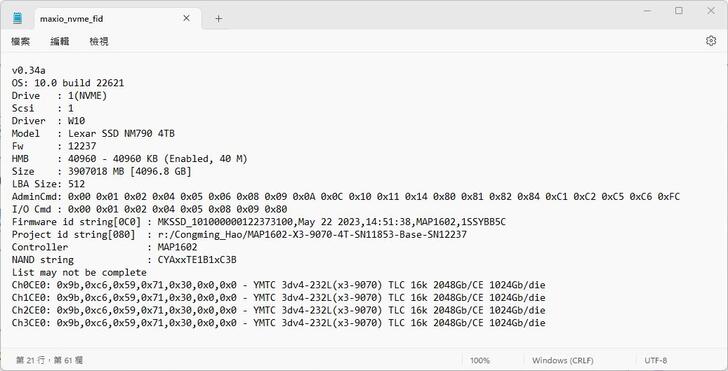 撕掉正面的貼紙後,可以看到,主控為中國的 Maxio MAP1602,為 DRAM-less 搭配 HMB 設計,最大支援容量 4TB。