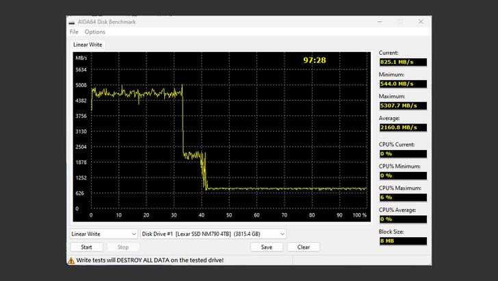 全硬碟循序寫入在過了大約 33% 後會降到 1,900MB/s 左右,最後降到 700 多 MB/s。