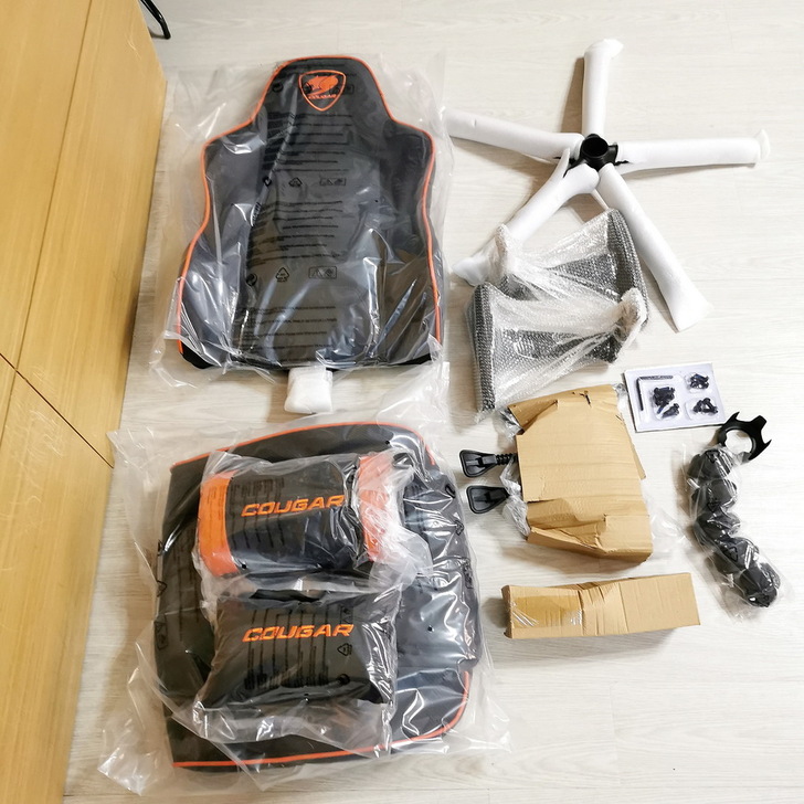 ▼ 把所有的 COUGAR FUSION S 電競椅 配件擺放整齊,可以看到配件都有使用一層保護包覆起來,避免碰撞損傷。