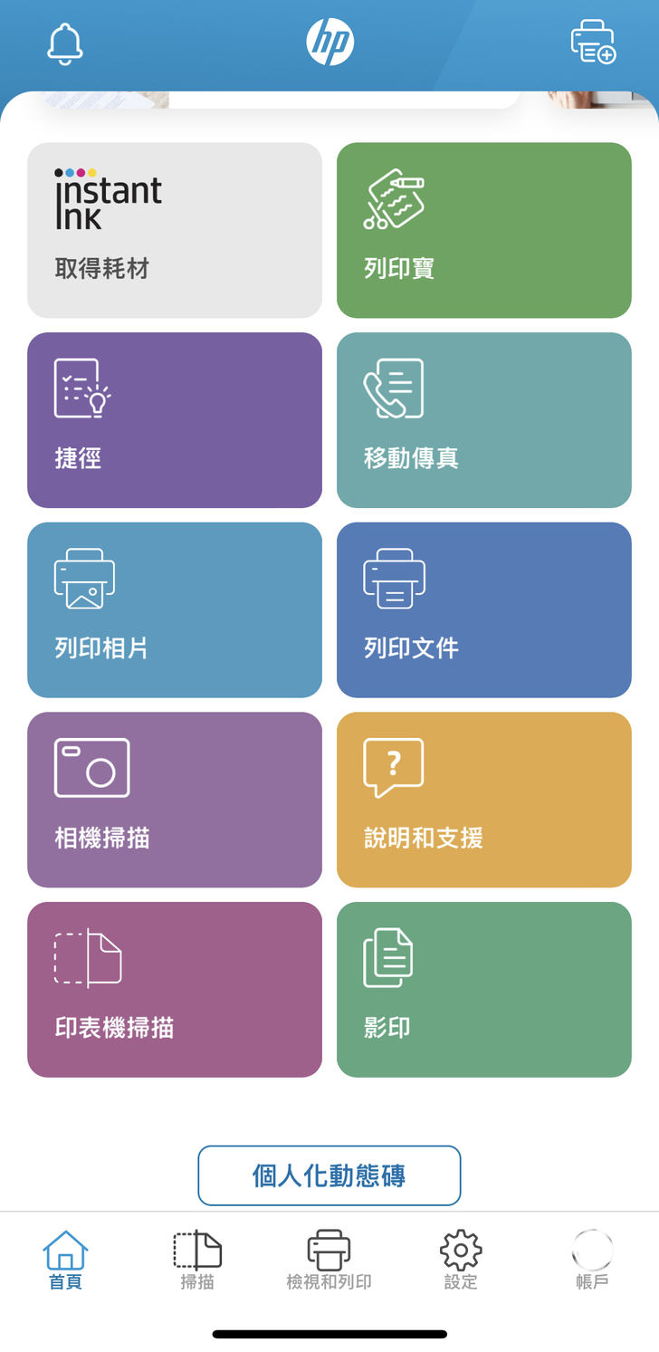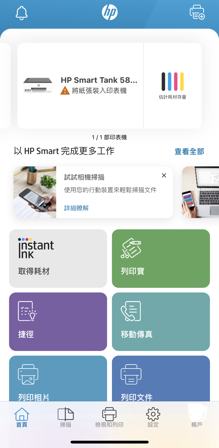 ▼ 安裝設定完 HP Smart 之後就可以看到 APP 的首頁,有許多的功能可以透過 APP 操作,而上方還可以看到墨水存量以及紙張放置的狀況。