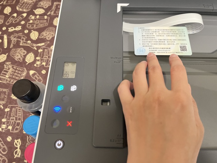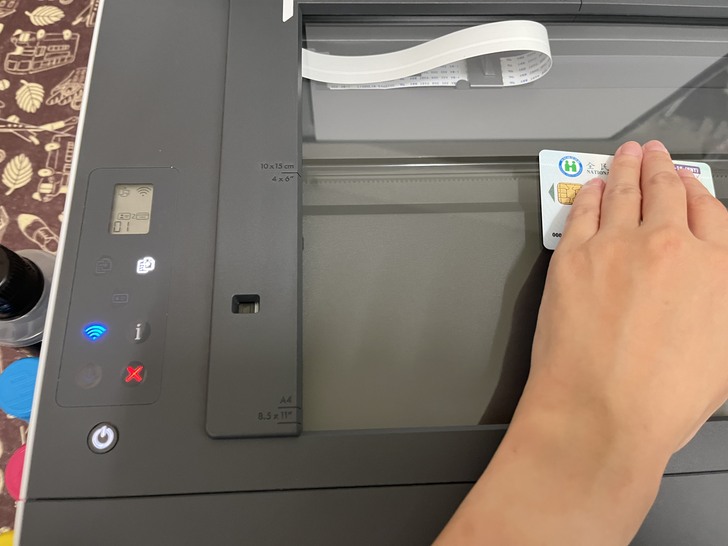▼ 接著再蓋起上蓋,然後按左上方綠色的按鈕,先掃描證件的一面,印表機會幫你暫存剛剛掃描的那一面。同樣的方式再操作一遍,再掃描另外一面,就會開始幫你列印了。