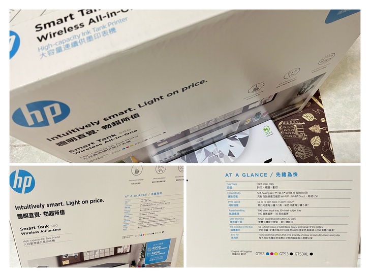 ▼把外盒重點展示一下,HP Smart Tank 580 印表機的多功能說明都能在上面看到,功能訴求就是讓你能夠以直覺不複雜的方式使用HP Smart Tank 580 印表機各樣的功能,還能夠節省各位荷包的錢錢。