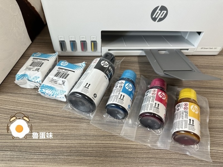 HP Smart Tank 580 連續供墨印表機配備包含了黑色墨水、彩色墨水以及黑色、彩色噴嘴頭,這些都是耗材以後要定期更換,基本上如果是一般家庭使用,搞不好1~2年才需要更換一次。