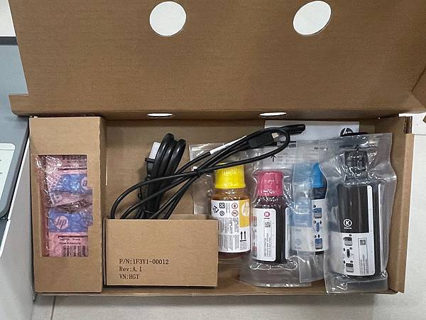 墨水、印刷噴頭、電線被完整的收納在一個小箱子裡,清楚明瞭。