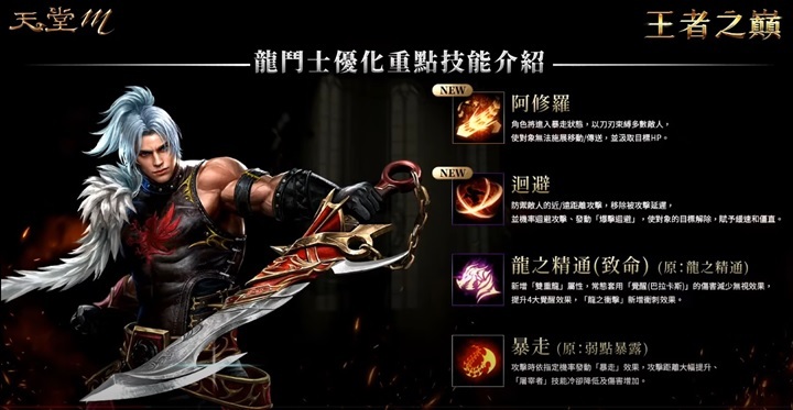 ↑龍鬥過往的印象是”傷害高但血少脆皮”,「王者之巔」改版後龍鬥獲得了生存技能神技「迴避」,能夠在一定條件下迴避掉各種傷害,龍之精通(致命)也改成了可以雙屬使用大幅增加減傷能力!新金技「阿修羅」更可以在提高大幅傷害的情況下將隱藏起來的敵人全部顯現並控制的技能