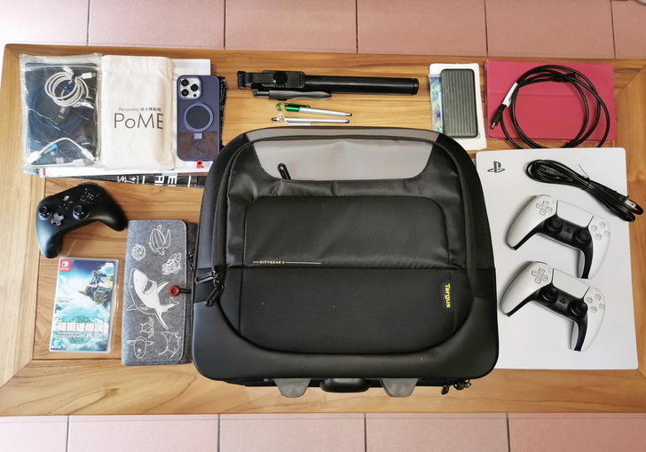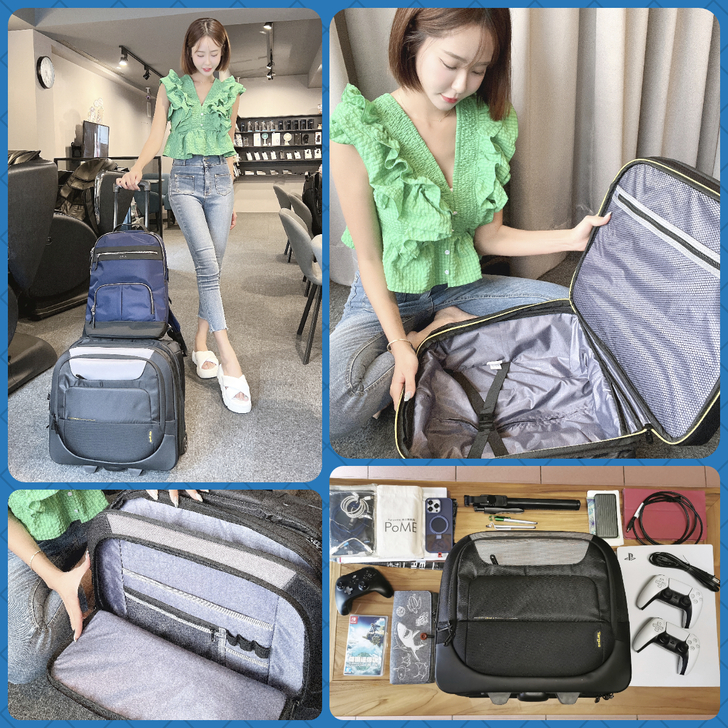 筆者使用此拉桿箱的最主要目的,是拿來放 PS5 帶去朋友家玩,因為 PS5 真的是巨大又笨重,加上還有兩支手把,不論是用背的、用提的真的是在練身體,有了這款拉桿箱,真的是方便又輕鬆。