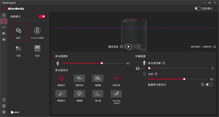 VibeEngine 已經預先設定好四種不同的收音情境模式可以套用,如果是要錄雙人對談的內容,像是採訪、會議、多人活動等情境,可以切換到聊天模式,這樣雙人以上的收音都會變得比較立體清晰;Podcast 模式顧名思義是針對 Podcast 使用;另外還有針對唱歌以及樂器等不同錄製情境設定的模式,讓聲音更有臨場感,對使用者來說不用花太多時間調整就可以快速套用,十分方便。