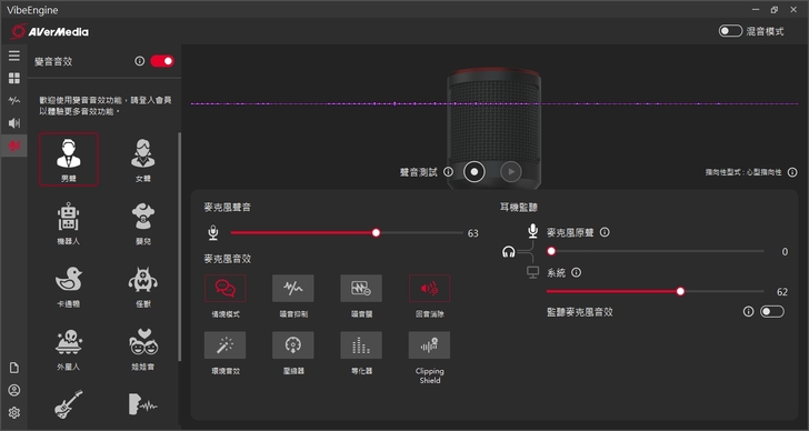 另外還有一個本人覺得很有趣的就是變聲效果,可以套用變音音效來創造不同的聲音,它提供男聲、女聲、機器人、嬰兒、卡通鴨、怪獸等等多樣化的音效可以快速套用。但記得要先登入 AVerMedia 會員,如此才能享受到所有的功能,這點千萬不要忘了。
