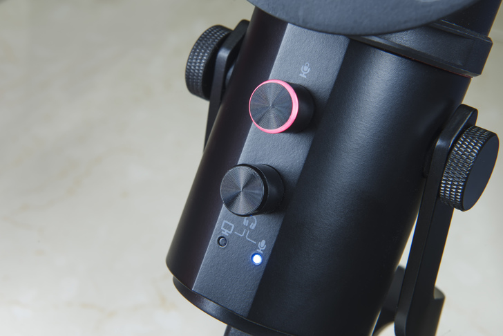 ▲機身設計上有靜音鈕和麥克風/系統音量調整鈕,需要靜音時只要按一下按鈕就可以即刻靜音,按鈕外圈也會發出紅色光提示使用者目前為靜音狀態。麥克風/系統音量則是依照左右旋轉旋鈕調整,操作非常直覺簡單