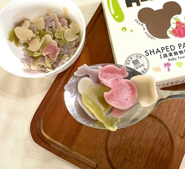 麵體本尊是用夾鏈袋裝的,這個部份我覺得很貼心~每次就倒寶寶吃的分量在把夾鏈袋壓緊,麵也比較不會受潮,我也不需要再另外找東西去裝!每盒蔬果動物麵都有五種造型,而麵的色澤也是用天然的蔬果調色,像是番茄、火龍果、籽地瓜、芝麻、菠菜這些,有些小朋友不愛吃蔬菜,也可以在吃寶寶麵的過程中攝取到一些蔬果的養分!