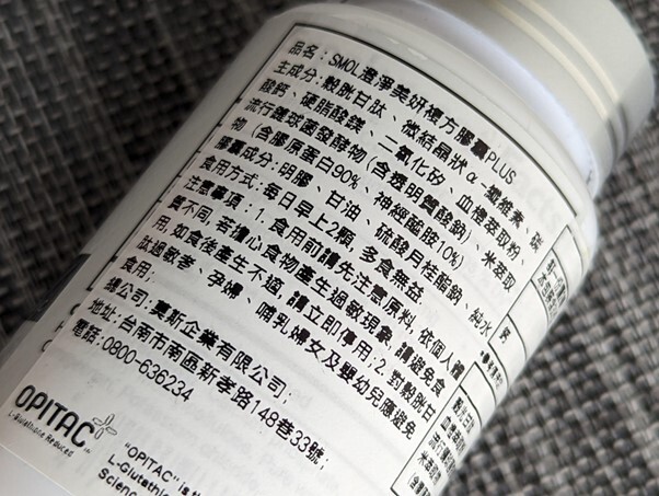這一罐SMOL澄淨亮妍複方膠囊成分有穀光甘肽、日本賽洛美、血橙萃取物…等等,都是對皮膚很好的成分,其中穀光甘肽是從圓酵母中所發酵而成,能增加肌膚水水嫩嫩的感覺哦!