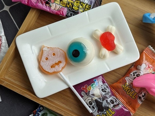 軟糖硬糖都有,而且造型都很特別,有南瓜臉的、眼珠子的、骷髏頭的(下圖)