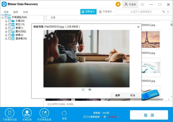第三步:掃描完畢後,您可以通過路徑、類型、檔案名稱等找到檔案並預覽。然後選擇要救援的檔案,點擊復原按鈕將其保存到電腦硬碟或其他存儲裝置。