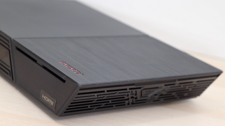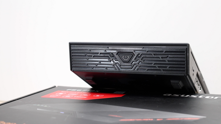 整體外觀還是比較電競取向,前面開機按鈕和周邊的燈光線條左右對稱,更營造出如跑車尾燈的速度感。雖然我個人不會排斥電競產品,但整體電競元素在 NAS 上算是比較多的,我會希望更樸素一點。但目前的設計,還是有科技感、未來感,從頂面看還可以騙騙說是 PS4。