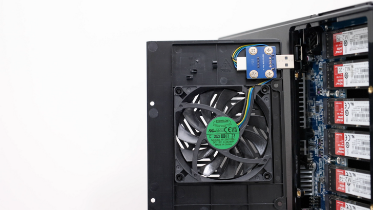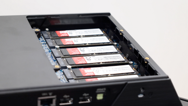前置有一個 USB-A(USB3.2 Gen2 10Gbps)。右上角開了兩條縫隙是進風口,機身內對應的位置就是一整排的 M.2 2280 SSD。