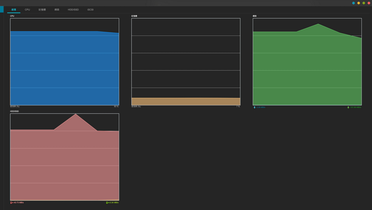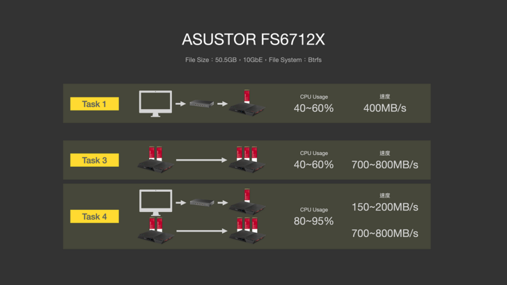 實測在這個情況下,CPU 佔用率已經在 80~95% 之間,很緊繃了。NAS 內的檔案互傳速度仍然沒什麼變,但是 10GbE 原本 400MB/s 掉到 150~200MB/s。因為我沒測過 FS6706T,或許在兩個 2.5GbE 的壓力下,CPU 佔用率就不會到這麼高。