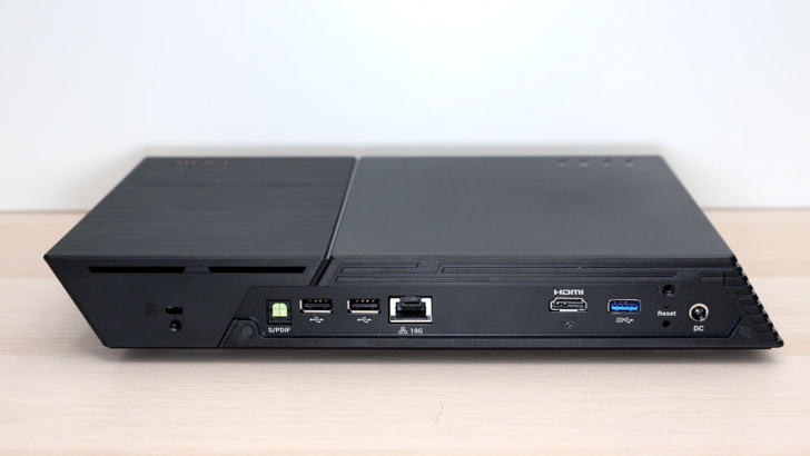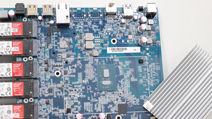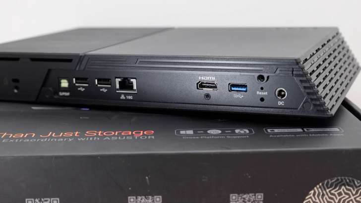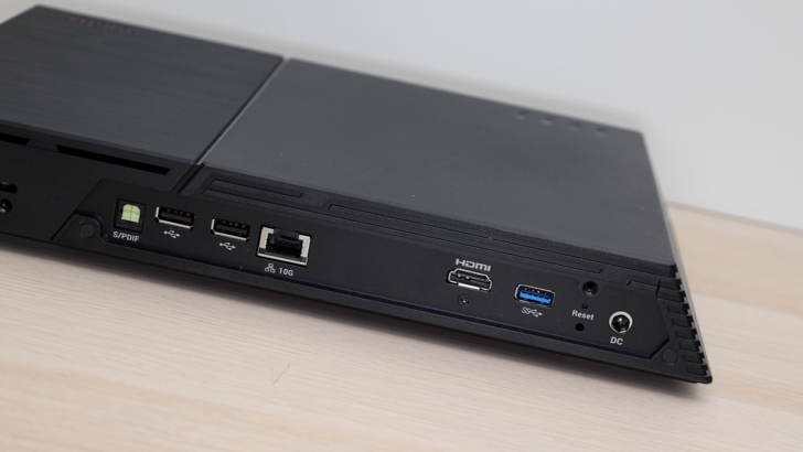 另一面對稱位置也有進風開孔。後置有防盜鎖、光纖 S/PDIF、兩個 USB-A(USB2.0)、10GbE、HDMI(HDMI2.0b)、一個 USB-A(USB3.2 Gen2 10Gbps)、Reset 和 Power In。可以理解整體架構受限核心硬體規格而沒有 USB-C,且 USB3 數量也不多。這方面作為消費者,可以準備 UBS Hub 來擴充,並且使用 USB-A to USB-C 的線來使用外接 SSD。其 USB-A 為 10Gbps 速度,剛好與這台機器的 I/O 規格(不管是(10GbE 還是 SSD PCIe 頻寬)差不多,基本上都不會成為彼此瓶頸。因此如果是透過 SSD 傳輸資料到 NAS 備份,也是一種合理、方便的手段。