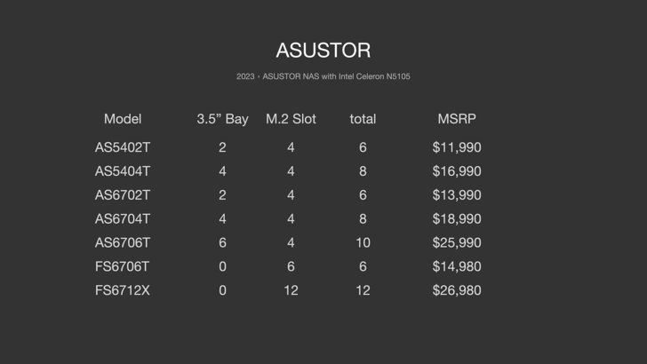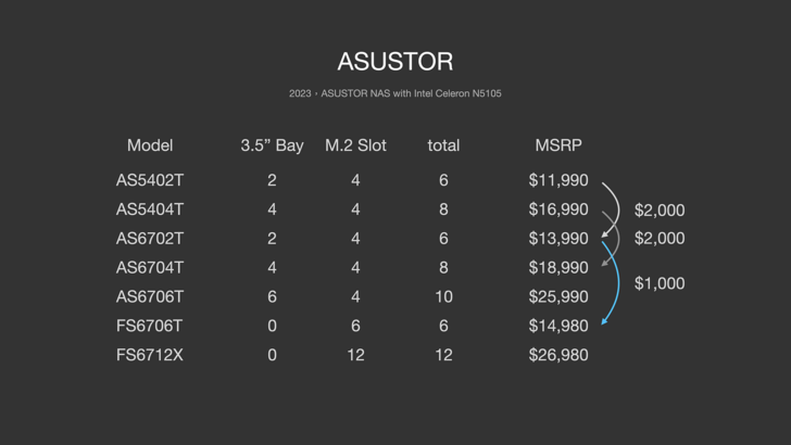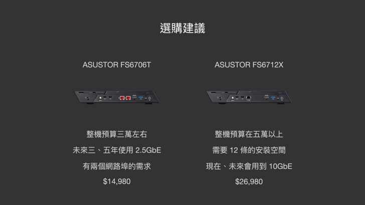 我覺得 FS67 這個系列真的是 ASUSTOR 推出最具革命性的產品。集速度、大容量、靜音、All Flash 於一身。目前分為兩款,入門款為 6 Bay M.2 的 FS6706T,價格 $14,980。高階款為 12 Bay M.2 的 FS6712X,價格為 $26,980。這次開箱的高階款,其型號 X 代表其具備 10GbE。本篇會從單款 FS6712X、FS67 系列、華芸全系列機種等幾個層面做分析。