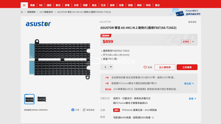 還有一個烏龍,我原本看網購以為原廠散熱片,一片 $899 也太貴了吧,比一般行情高出許多。雖然他是 ASUSTOR 專用,且一片可以壓兩條,但若 FS6712X 要裝滿,就要花 $5,400,實在是一筆不小的配件開銷。後來跟原廠確認,這個 $899 的價格是三片一組,所以實際約 $1,800 可以買齊六片,並不是盤子價。希望網購頁面可以寫清楚一點,避免消費者對 ASUSTOR 配件的誤會。