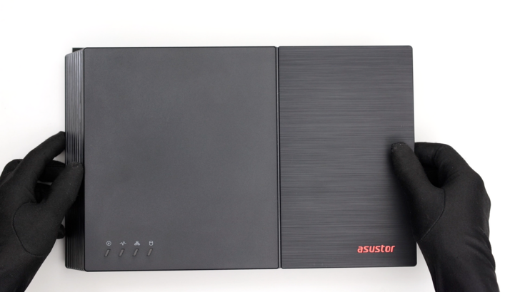 從外觀大小來說,他大概就是兩台路由器的大小。正面與底部皆為塑膠材質,兩側 I/O 則為金屬外殼。頂面簡單分為兩個區域,左下角為燈號指示燈。右邊仿髮絲紋的部分,有 ASUSTOR Logo。整機有三年保固。