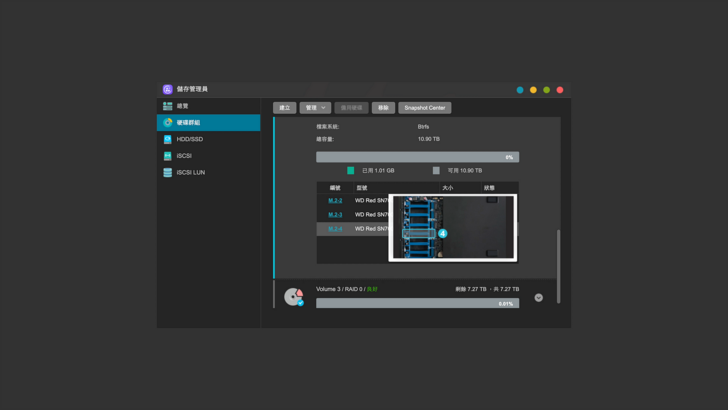 滿不錯的是,在系統中也可以看到他會在畫面上提示各條 SSD 安裝的位置,可以對應到主機板上的 SSD 編號,算是有基本的管理功能。