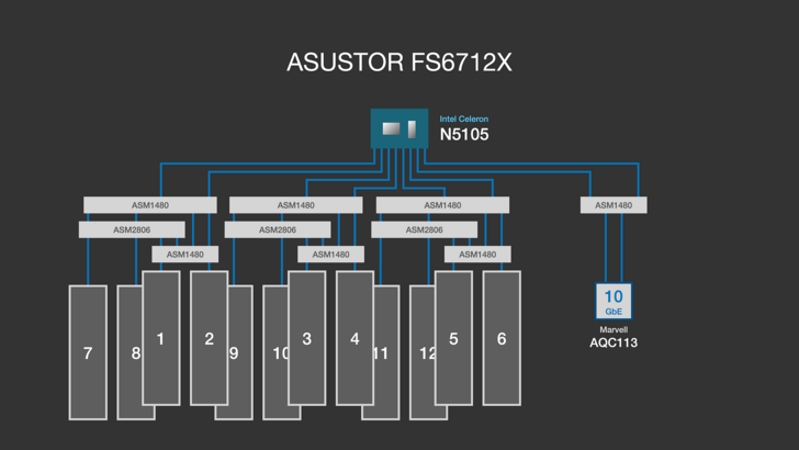 而 12 Bay 的 FS6712X,同一顆 CPU,所以一樣只有 8 lane。2 lane 分給 10GbE,為Marvell AQC113。剩下 6 lane,每兩條 lane 一組,經過一連串 Switch,分給四條 M.2,每四條 M.2 一組,共三組。舉其中一組來說,正面 1、2 和背面 7、8 是一組。使用的 PCIe Switch 來自同為華碩集團的 ASMedia(祥碩),ASM1480 和 ASM2806,這樣的設計讓 12 Bay 的機種不管是正面、背面的 SSD 都能發揮到至少一條 PCIe lane 的速度。