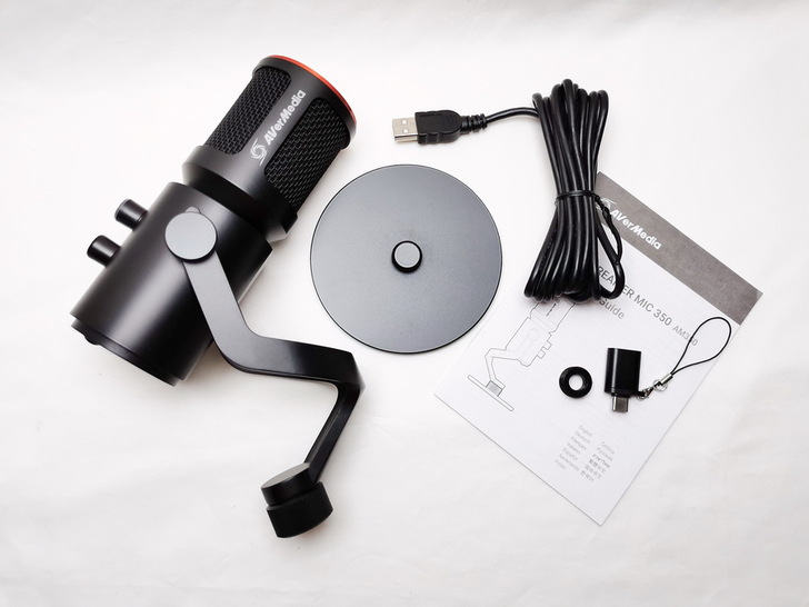 ▼ 內容物 - 圓剛 AM350 黑鳩 USB 電容式麥克風 本體、底座、USB轉Type-C 連接線、Type-C 轉接頭、螺牙轉接頭、說明書。