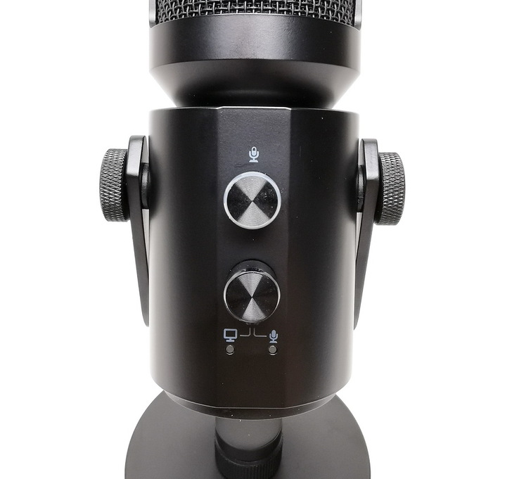 ▼ 圓剛 AM350 正面 - 上方按鍵旋轉調整音量大小,按壓後切換成靜音;下方按鍵為切換耳機監聽的模式,按壓來切換麥克風原聲及調效後的聲音,旋轉是調整音量的大小。