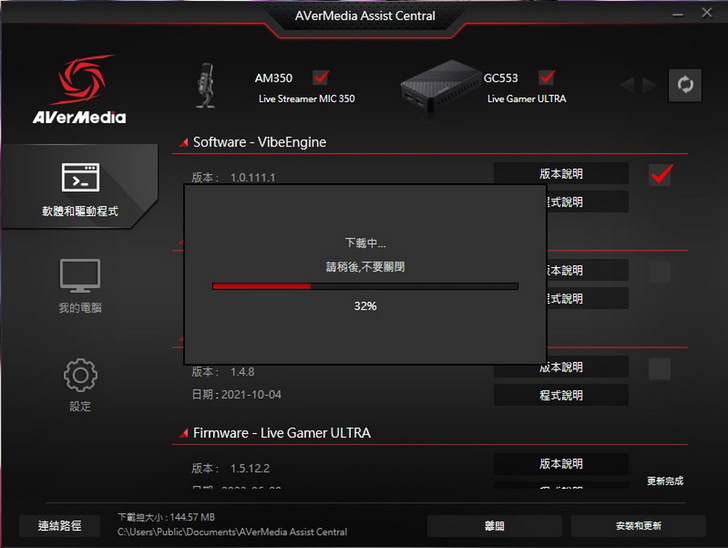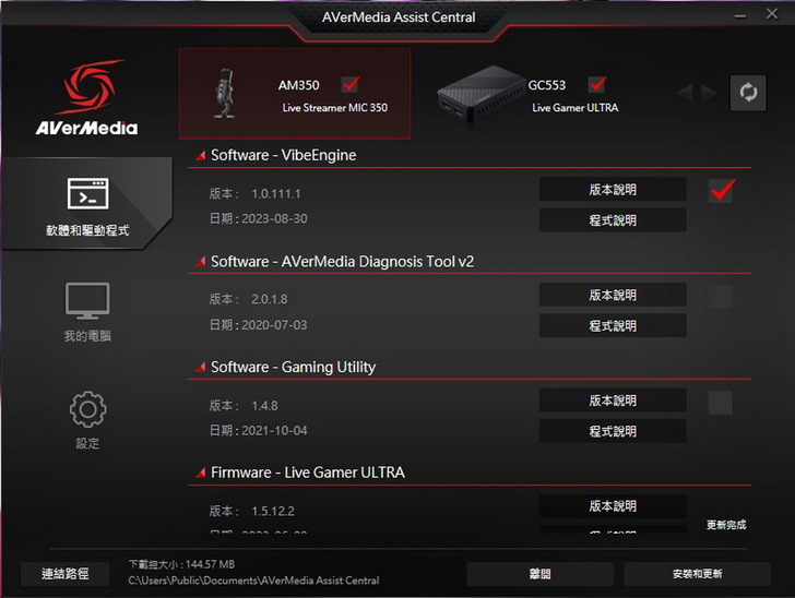 ▼ 因為本身有在用 圓剛 GC553 擷取盒,早就安裝過 AVerMedia Assist Central,一打開程式就會自動偵測出需要安裝的軟體 VibeEngine。