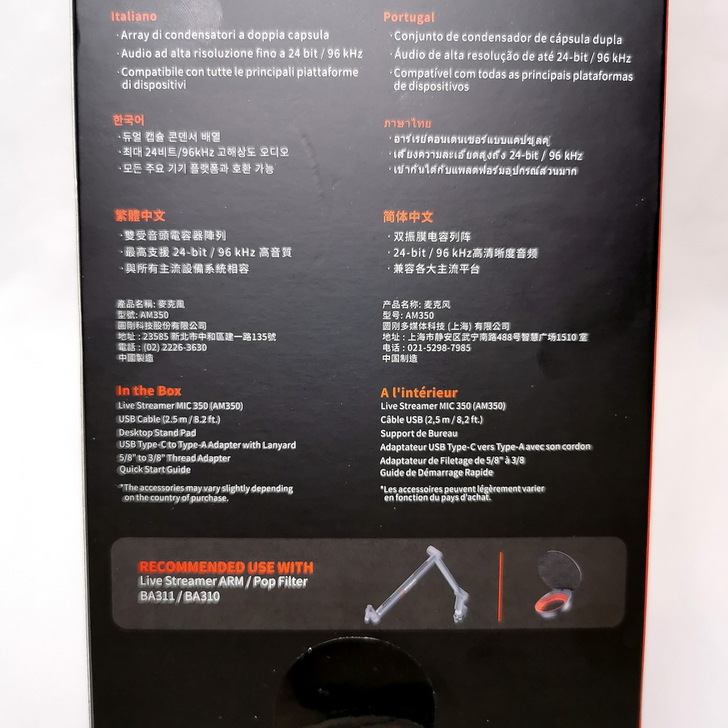 ▼ 外盒背面 除了多國語言,下面還列出了兩款專業配件,圓剛 BA311 支架 和 這次也有開箱的 專業防噴罩 BA310。