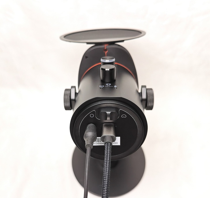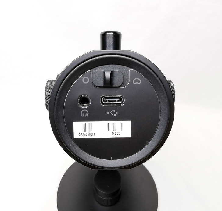 ▼ 圓剛 AM350 底部 - 上方的切換鍵 一鍵切換「心型指向收音」或「全指向收音」,下方是 3.5mm耳機監聽孔、Type-C連接孔。