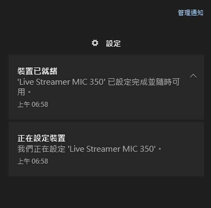 ▼ 隨插即用的 圓剛 AM350 電容式麥克風,一接上電腦系統馬上就會跑出通知。