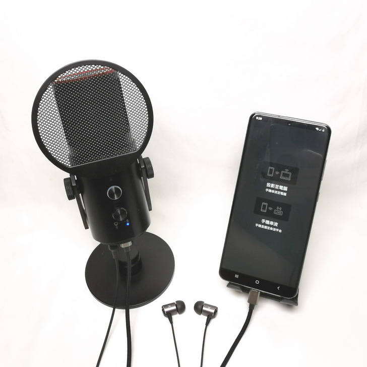 ▼ 因為是要手機直播,直接切換至 心型指向收音,下方也接了 監聽耳機,不過這時 AM350 也是經由手機直接連接,除非有其它的供電方式,不然電量的消耗應該很快。