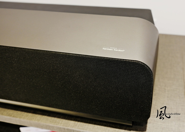 黑色喇叭網布裡面配有左右各1組1吋5W高音揚聲器與2.5吋15W全音域喇叭,由Harman/Kardon開發的40W Soundbar,使得X1000-4K+在內建音效方面表現出色。