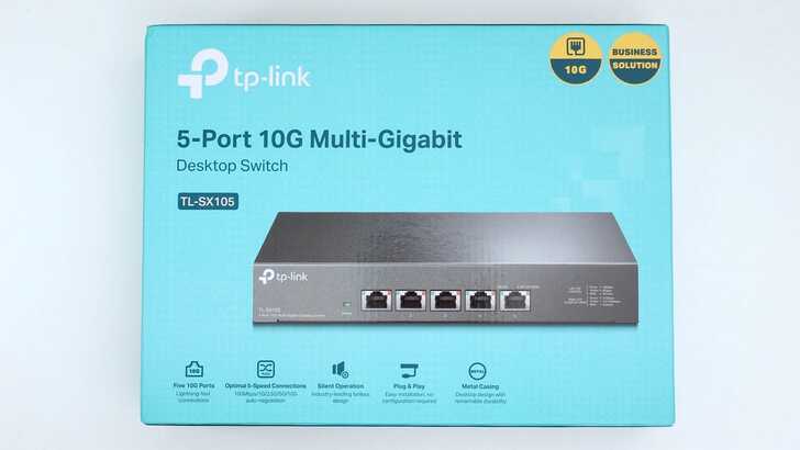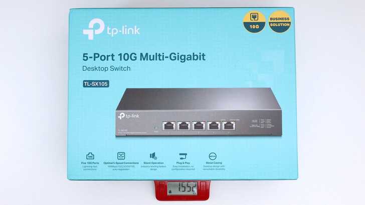 TP-Link TL-SX105 包裝重量約 1,552g。以 TP-Link 的代表色為底,左上角有 TP-Link Logo,右上角有 10G 和 Business Solution 的標示。品名是 5-Port 10G Multi-Gigabit Desktop Switch。Multi-Giga 支援 100M、1G、2.5G、5G、10G。