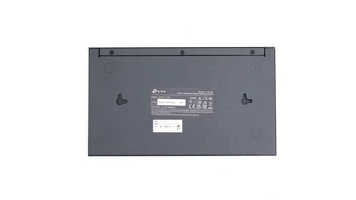 TL-SX105 背面有兩個壁掛鎖孔,中間有兩個產品標籤貼紙,不過貼得不是很正。金屬機殼四個角落有沖壓的凹槽,方便使用者黏貼腳墊。